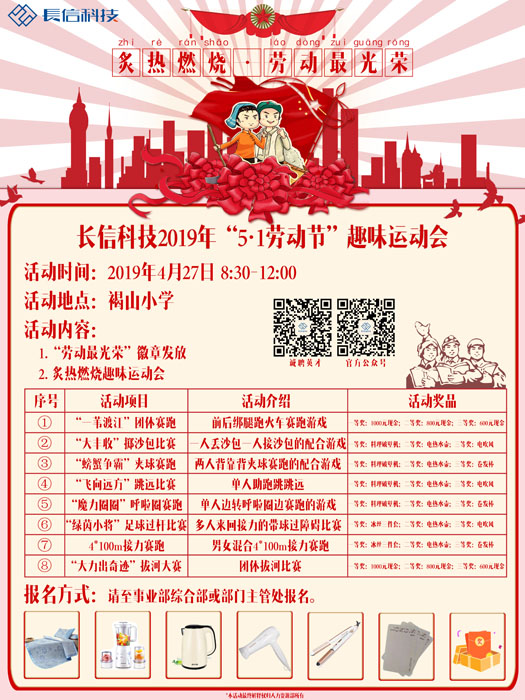 “五一国际劳动节”即将来临,为丰富员工业余生活,加强企业文化建设,公司决定于4月27日上午8:30-12:00举办以“炙热燃烧·劳动最光荣”为主题的庆五一趣味运动会。