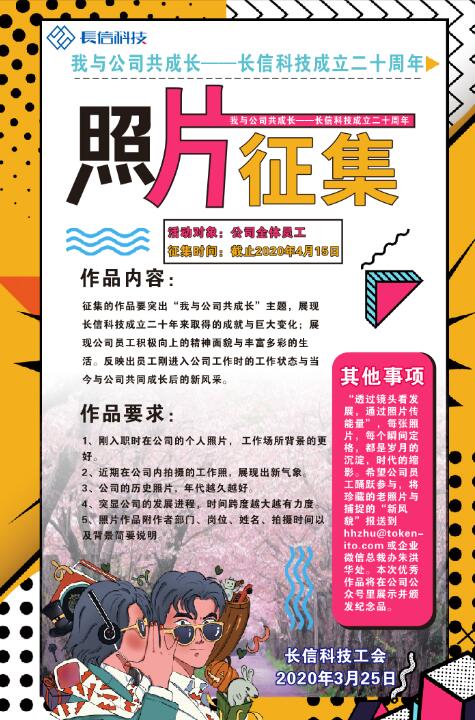 征集的作品要突出“我与公司共成长”主题,展现长信科技成立二十年来取得的成就与巨大变化;展现公司员工积极向上的精神面貌与丰富多彩的生活。反映出员工刚进入公司工作时的工作状态与当今与公司共同成长后的新风采。